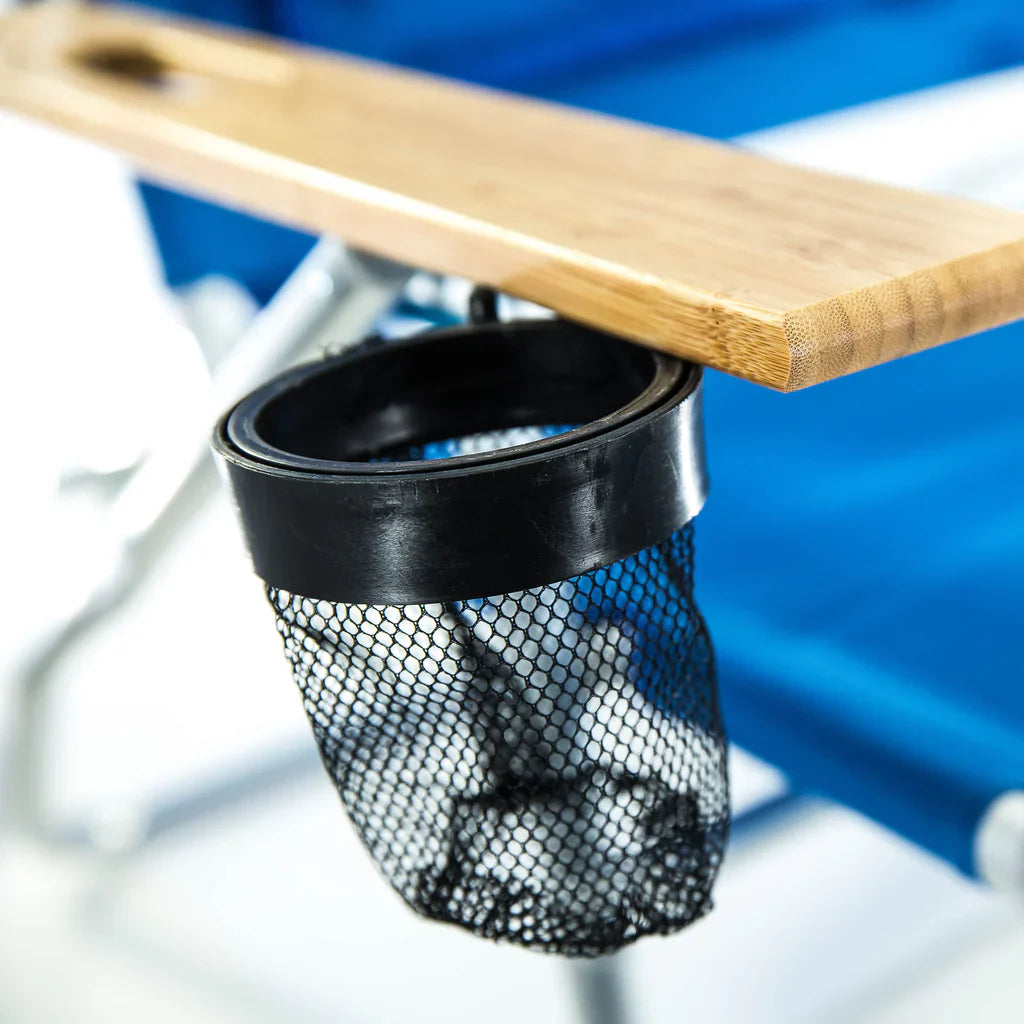 Draagbare buitenstoel: Met de meegeleverde draagriem is de stoel gemakkelijk mee te nemen. Hij is voorzien van een ingebouwde bekerhouder en extra brede houten armleuningen voor extra comfort.